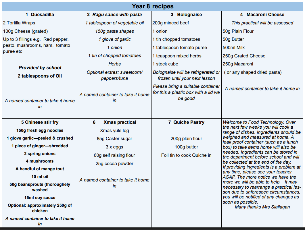 The Year 8 Food Curriculum focuses on the ability to cook a global dish. Many international dishes are included, and pupils quickly learn high level skills, such as: handling raw meat, seasoning and multi-tasking. Theory work is based around global issues regarding food distribution, the environmental impact of growing/farming methods and ethics such as Fairtrade. The pupils’ confidence levels rise to be able to cook independently and adapt recipes to suit their family’s needs. Following demonstrations, pupils cook a range of products, all recipes, pictorial versions, and video demonstrations are available on this platform to pre-prepare and even carry out test runs to practise their skills at home. A GCSE style independent project gives pupils a chance to plan and provide a 3-course meal for a particular consumer group (students) with opportunities for extension tasks built in. All products are self-assessed, and teacher assessed against success criteria.